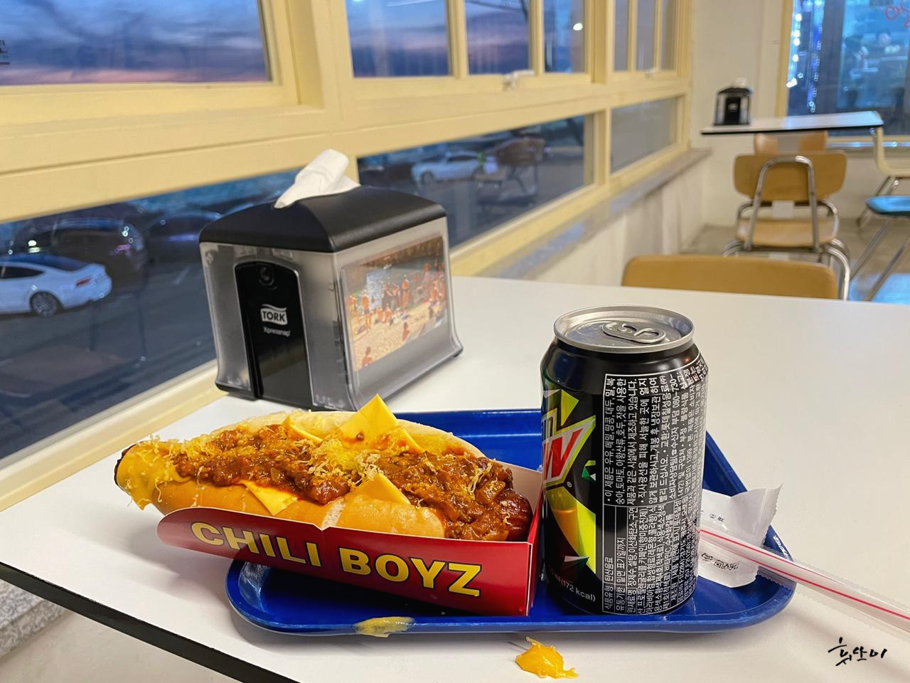 건물 1, 2층으로 되어있는 칠리보이즈는 간판이 크게 보이지는 않지만, 앞에 서있는 HOTDOG 입간판이 눈에 띈답니다.
