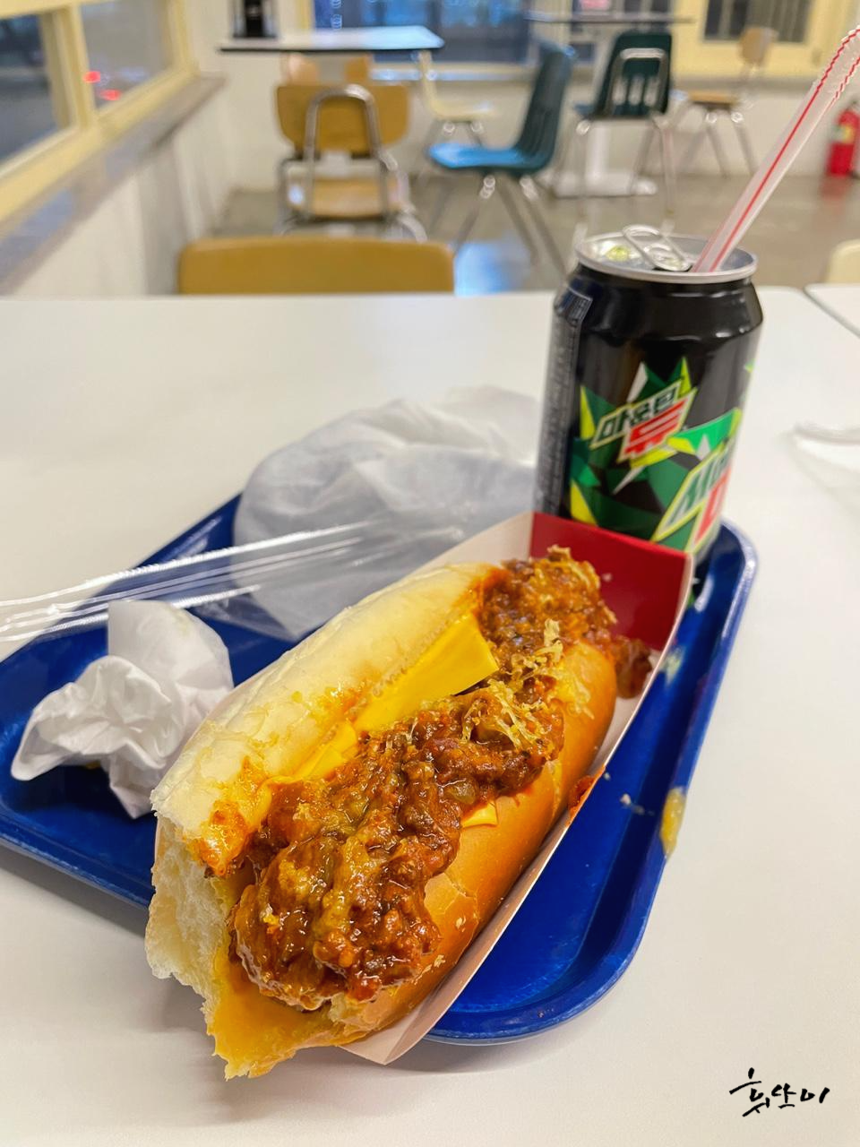 기본 핫도그인 칠리독에 치즈를 뿌린 핫도그였어요.